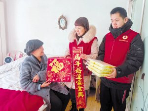 社区志愿者为老人送上新年祝福。
